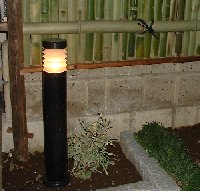この照明灯は灯龍の横にも置かれてあり、センサーにより日暮れに自動点灯されるようにしている(消灯はタイマー設定)。照度が低いので、夜間はとても幻想的だ。