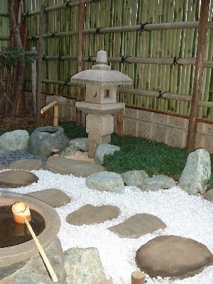 灯籠の横に置かれてあるのは、つくばいと筧(かけい)。これは和風庭園で水を演出するのにかかせない構成要素で、物理的に池を掘ったり実際の滝流れを演出することのできない小さな庭には有効である。